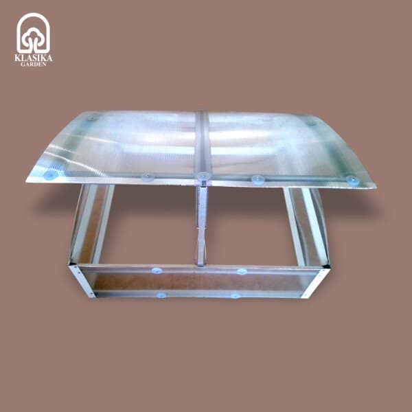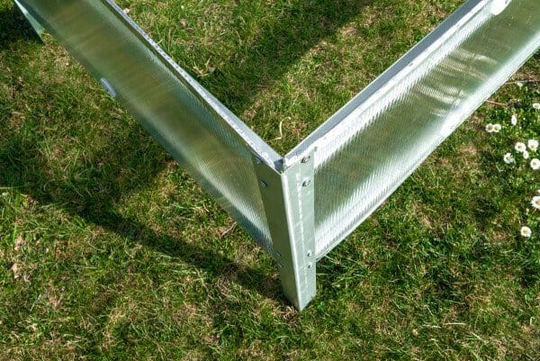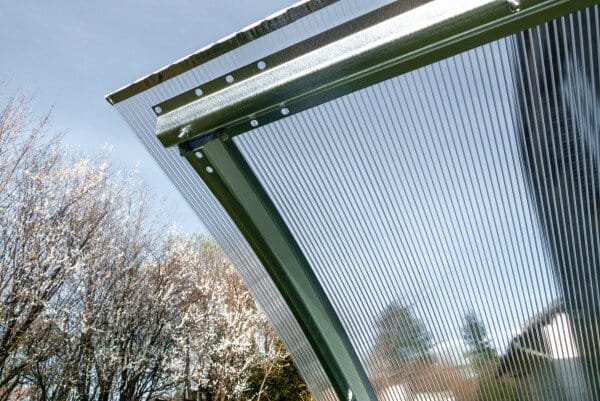 Konstrukcija je stabilna in zasnovana za dolgo življenjsko dobo. 4 mm polikarbonat nudi odpornost na vremenske vplive in UV zaščito.