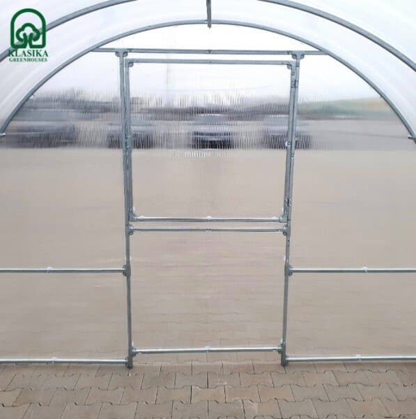 Rastlinjak 3×4 m je opremljen z dvodelnimi vrati in dvema oknoma, kar omogoča učinkovito prezračevanje. Možna je tudi nadgradnja z avtomatskim odpiranjem strešnega okna.