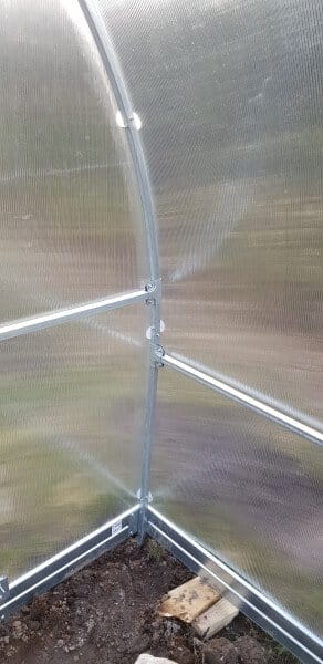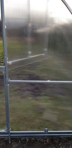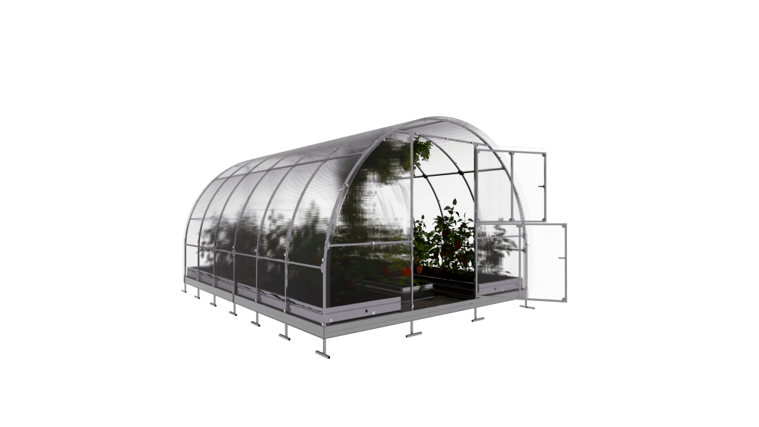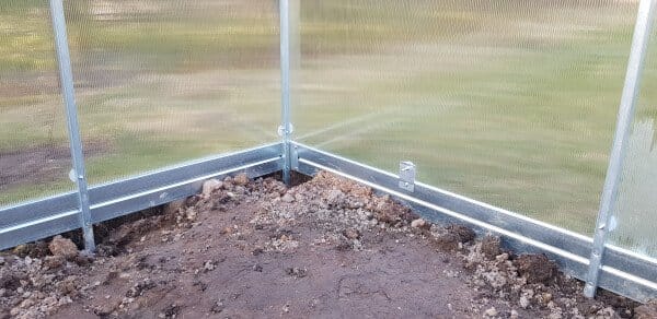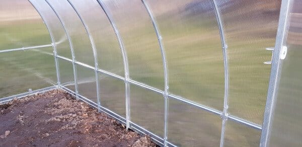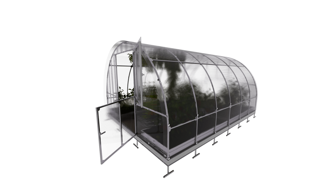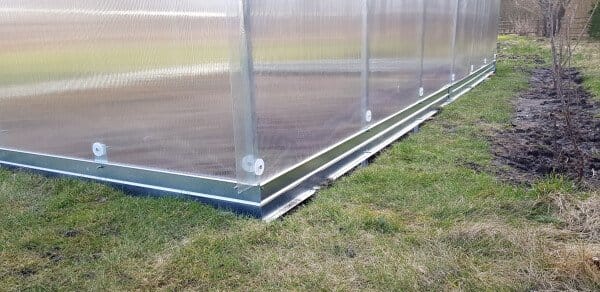 Rastlinjak vključuje kovinske podstavke višine 10 cm, ki izboljšajo stabilnost konstrukcije in preprečujejo stik polikarbonata s tlemi.