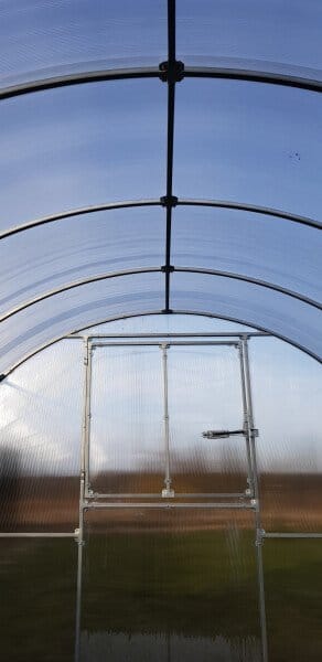 Polikarbonat debeline 6 mm zagotavlja zelo dobro toplotno izolacijo, kar omogoča zgodnejši začetek sezone in podaljšano rast rastlin. Prepušča približno 85 % svetlobe ter ščiti rastline pred UV-žarki. Material je odporen na udarce, točo in vremenske vplive.