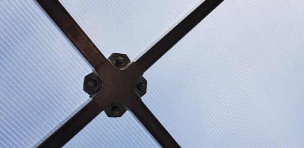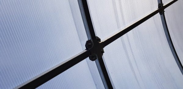Konstrukcija je izdelana iz kvadratnih pocinkanih jeklenih profilov dimenzije 20×20 mm in debeline 1 mm, kar zagotavlja visoko trdnost in dolgo življenjsko dobo. Sistem povezovanja z vijaki M5 (KRAB sistem) dodatno utrdi konstrukcijo. Zaradi razmika med loki 0,67 m je rastlinjak 3×4 m stabilen in odporen na obremenitve.