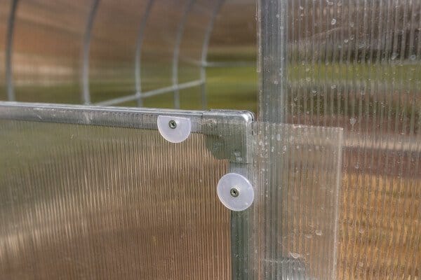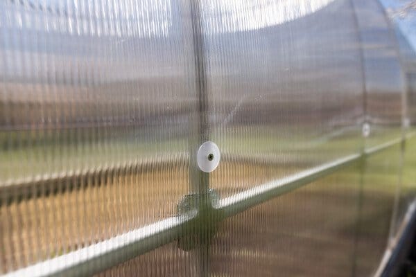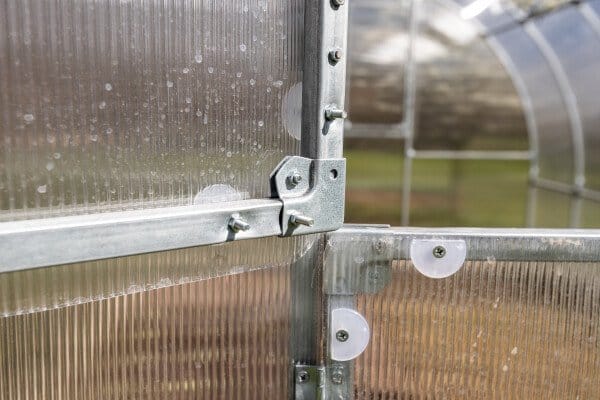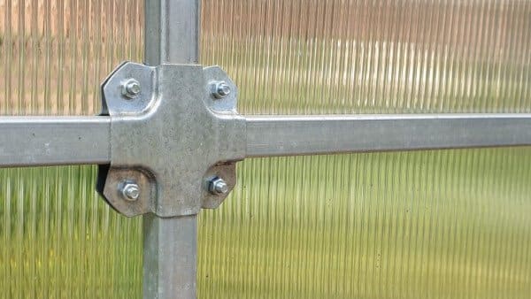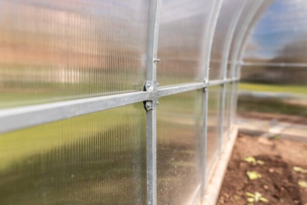 Konstrukcija je izdelana iz pocinkanih jeklenih profilov dimenzije 20×20 mm in debeline 1 mm, kar zagotavlja visoko trdnost in dolgo življenjsko dobo. Sistem povezovanja z vijaki M5 (KRAB sistem) dodatno utrdi konstrukcijo. Zaradi razmika med loki 0,67 m je rastlinjak 3×8 m zelo stabilen in odporen na obremenitve.