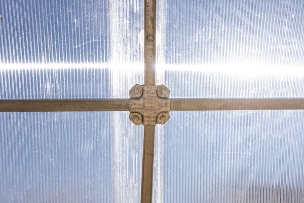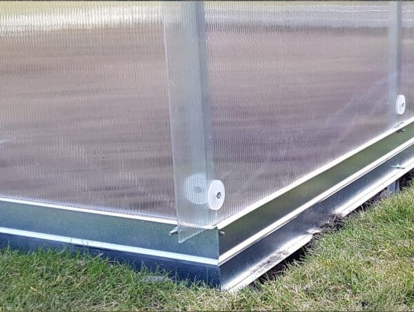 Rastlinjak vključuje kovinske podstavke višine 10 cm, ki izboljšajo stabilnost konstrukcije in preprečujejo stik polikarbonata s tlemi.