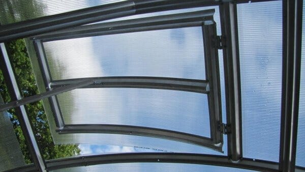 Strešno okno omogoča učinkovito prezračevanje rastlinjaka, kar je ključno za zdravo rast rastlin in stabilne pogoje v notranjosti.